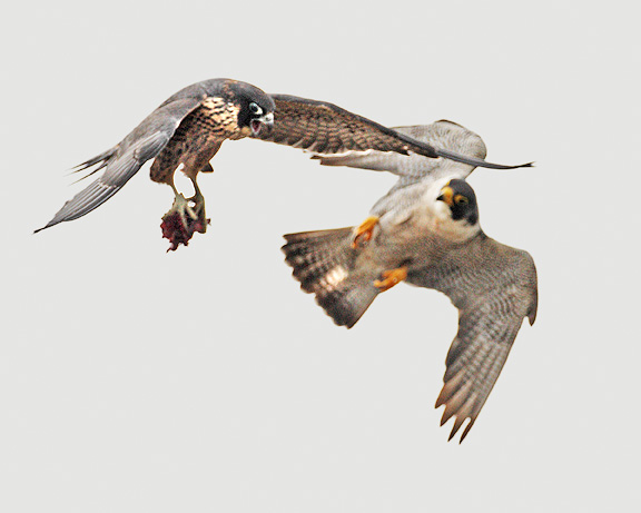 After the first flight, they are reluctant to fly again, but the parent will bait them with food. Once they master this they will take food in the air. If the chick doesn’t finish eating the prey, the parent will take it to another chick. After the chick learns to take food from talons, the next lesson is to catch it in the air. Next is to bring in an injured bird and the chick will have to fly after it. The young start venturing away from the rock after 2-3 weeks, 1/4 to 1/2 mile always returning to the rock.